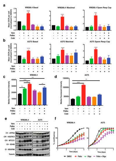 Palbociclib increases mitochondrial respiration in melanoma cells. (a,b) Oxygen consumption rate (OCR) was determined using Seahorse extracellular flux analysis in WM266.4 and A375 cells treated as indicated for 72 h with palbociclib (palbo; 1 M), vemurafenib (vem; 300 nM), cobimetinib (cobi; 10 nM) or their combination. Data are normalised to cell number and expressed as fold change relative to DMSO controls. (c,d) Mitochondrial mass and activity were determined as the median fluorescent intensity of Mitotracker staining measured using FACs analysis in WM266.4 and A375 cells treated as indicated for 72 h. (e) WM266.4 and A375 cells were treated as indicated for 72 h, and protein lysates were assessed for the indicated proteins using Western blot analysis. (f) WM266.4 and A375 cells were treated with palbo (1 M) and/or oligomycin (1 M) for 6 days, and percent confluency was analysed over time using an IncuCyte to assess cell proliferation. Data is representative of 3 biological replicates. Error bars SEM, n = 3. Statistical significance was determined by One-way ANOVA: * p = 0.05–0.01, ** p = 0.01–0.001, *** p = 0.001–0.0001, **** p < 0.0001.