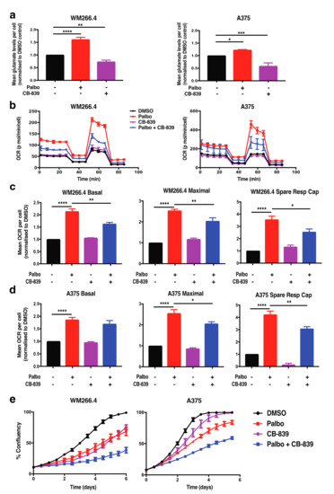 Increased mitochondrial metabolism following palbociclib treatment is partially dependent on glutamine metabolism. (a) Intracellular glutamate levels were assessed in WM266.4 and A375 cells treated for 72 h with CB-839 (200 nM) and palbociclib (Palbo; 1 M) as indicated. Data are normalised to cell number and expressed as fold change relative to DMSO controls. (b) Oxygen consumption rate (OCR) was determined using Seahorse extracellular flux analysis in WM266.4 and A375 cells treated for 72 h as indicated. Data show a representative profile from 3 independent experiments. (c,d) Basal OCR, maximal OCR and spare respiratory capacity were determined from OCR profiles shown in (b) for WM266.4 (c) and A375 (d) cells. Data are normalised to cell number and expressed as fold change relative to DMSO controls. (e) WM266.4 and A375 cells were treated with palbo (1 M) or CB-839 (200 nM) for 6 days, and percentage confluency was analysed over time using an IncuCyte to monitor cell proliferation. Data is representative of 3 biological replicates. Error bars SEM, n = 3. Statistical significance was determined by One-way ANOVA: * p = 0.05–0.01, ** p = 0.01–0.001, *** p = 0.001–0.0001, **** p < 0.0001.