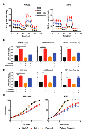 Interestingly, fatty acid oxidation has also been shown to play a role in CDK4 regulated metabolic reprogramming in other cancers [17]. Given that fatty acid oxidation also drives mitochondrial metabolism by feeding into the TCA cycle, the role of this pathway in metabolic reprogramming following CDK4/6 inhibition in melanoma cells was investigated. To determine whether the palbociclib-induced increase in mitochondrial metabolism was dependent on fatty acid oxidation, we utilised etomoxir, a specific inhibitor of CPT1, a mitochondrial transporter of long-chain fatty acids [23]. OCR values were observed following treatment of cells with etomoxir for 1 h and palbociclib for 72 h (Figure 4a). Notably, a significant decrease in basal OCR was observed in both cell lines following treatment with etomoxir alone for 1 h (Figure 4b,c), confirming activity of this inhibitor in melanoma cells. Etomoxir significantly decreased the palbociclib-induced increase in basal respiration, however a reduction in spare respiratory capacities was only observed in the WM266.4 cells (Figure 4b,c). Etomoxir alone had no effect on cell proliferation assays and did not alter the response to palbocilib (Figure 4d). Collectively, these observations indicate that although fatty acid oxidation plays a role in the metabolic response to palbociclib treatment in melanoma cells, this does not impact cell proliferation.