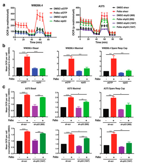 p53 regulates metabolic reprogramming following palbociclib treatment in melanoma cells. (a) Oxygen consumption rate (OCR) was determined using Seahorse extracellular flux analysis in WM266.4 and A375 cells treated for 72 h with palbociclib (palbo; 1 M). Data show a representative profile from 3 independent experiments. (b,c) Basal OCR, maximal OCR and spare respiratory capacity were determined from OCR profiles shown in (a) for WM266.4 (b) and A375 (c) cells. Data are normalised to cell number and expressed as fold change relative to DMSO controls. Error bars SEM, n = 3. Statistical significance was determined by one-way ANOVA: * p = 0.05–0.01, ** p = 0.01–0.001, *** p = 0.001–0.0001, **** p < 0.0001.