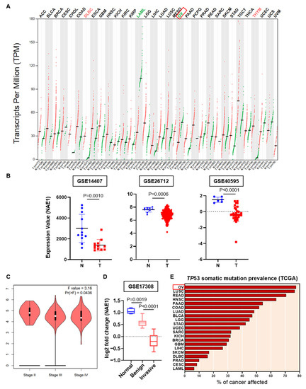 3.2. Associations of NAE1 Expression, the Pathological Stage, and TP53 Mutation Prevalence in Ovarian Tumors