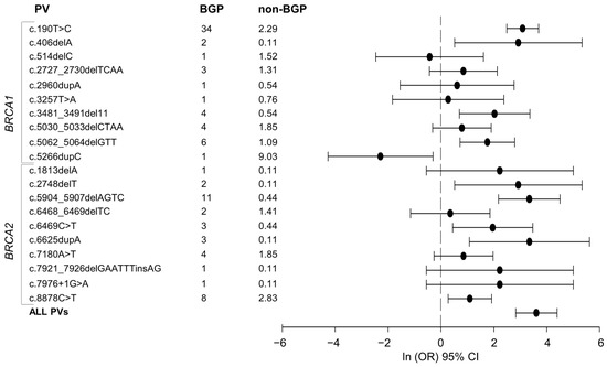 In 1019 carriers, we identified a total of 304 different PVs; of these, 25 were found in BGP carriers and 299 in non-BGP carriers. Thus, 20 PVs were common to the BGP and non-BGP cohorts. We studied the PV distribution and frequency to test whether or not the BGP and non-BGP PV spectra were different. As a first test, we considered the number of different PVs with respect to the number of carriers in the two cohorts. Since 299 different PVs were observed in the 919 non-BGP carrier cohort, 32 PVs should have been proportionally found in the 100 Bergamo carriers. On the contrary, in this cohort, only 25 PVs were identified. Even if these numbers are not statistically different (X2 (dof=1) = 1.28, p = 0.26), the Bergamo PV spectrum seems to comprise a smaller number of PVs. Consistently, four PVs account for approximately 59% of the BGP carriers while 50 PVs were necessary to explain 59% of the non-BGP carriers. We further studied the distribution of the 10 most frequent PVs in the non-BGP carriers (Table 2). None of these PVs had the same frequency in the BGP carriers. In particular, one PV was statistically less frequent in the BGP cohort with frequency difference of 8 (p = 0.0056). Five PVs were more frequent in the BGP carriers with three showing statistically significant higher frequency difference between 4.9 and 31.7, and two having frequency difference slightly higher than 2. The four remaining PVs, which altogether were found in 75/919 (8.2%) of the non-BGP carriers, were not found in the BGP carriers (Table 2). Finally, we studied the 20 PVs that were found in both the BGP and non-BGP carriers. We implemented a univariate logistic regression analysis to assess the strength of association between being carrier of a given PV and the BGP versus non-BGP birth sites. Figure 1 reports the odds ratios (ORs) and 95% confidence intervals (95% CI) in logarithmic scale. We observed that 10 PVs were statistically associated with the birth site. Of these PVs, nine were found to be positively associated with BGP birth site indicating that carriers of one of these nine PVs are more likely to be from BGP than those without PVs. Overall, by jointly considering the carriers of at least one of the 20 PVs their likelihood to be from BGP is about 37 times higher than those without PVs. Altogether, these data point out that the BGP BRCA1/2 PV spectrum is characterized by lower heterogeneity with respect to the non-BGP carriers. Moreover, the BGP and non-BGP PV spectra appear to be different in terms of PV distribution, type and frequency.