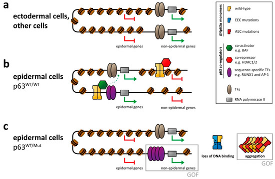 p63-mediated gene regulation affected by syndromic mutations. (a) In ectodermal and other non-epidermal cell types, the chromatin of enhancer and promotor regions of epidermal genes is not accessible, resulting in repression of those genes. (b) In epidermal cells p63 binds to promotor and (super-)enhancer regions of epidermal genes and cooperates with other transcription factors (TFs) and epigenetic modifiers as co-activators in transcribing those genes. Transcription of non-epidermal genes is repressed by the recruitment of epigenetic modifiers acting as co-repressors. Other non-epidermal genes are repressed indirectly (due to lack of non-epithelial TFs or inaccessible chromatin). (c) In cells with heterozygous p63 mutations, the proper p63-mediated chromatin and transcriptional regulation is affected, resulting in silencing of epidermal genes as well as the expression of non-epidermal genes. This is caused either by loss of p63-related repression or by a gain of function (GOF) mechanism via transcriptional activation by overexpressed/deregulated transcription factors normally associated with p63. In case of the EEC syndrome, this GOF mechanism has been demonstrated for the RUNX1 transcription factor. While not formally demonstrated yet, GOF effects are also predicted for the AEC syndrome via a co-aggregation mechanism.