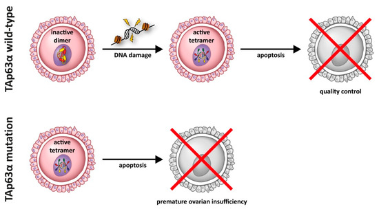 In resting oocytes, TAp63α is kept in an inactive state as a closed dimer. This dimer is converted into an active tetrameric state through a kinase cascade following the detection of DNA damage. In its active tetramer form, TAp63α induces an apoptotic program in damaged oocytes. Certain mutations of TAp63α result in the formation of a constitutive active and tetrameric form that induces oocyte death even without DNA damage, thus resulting in premature ovarian insufficiency.