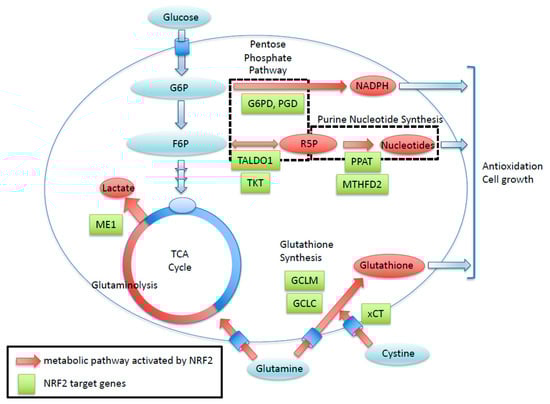 NRF2 enhances the cancer metabolic pathway through the gene expression involving the pentose phosphate pathway, purine nucleotide synthesis, glutaminolysis, and glutathione synthesis. Green boxes exhibit NRF2-target genes with ARE sequence. Red arrows show metabolic pathways activated by NRF2. R5P, Ribose 5-phosphate; G6P, Glucose-6-phosphate; F6P, Fructose 6-phosphate