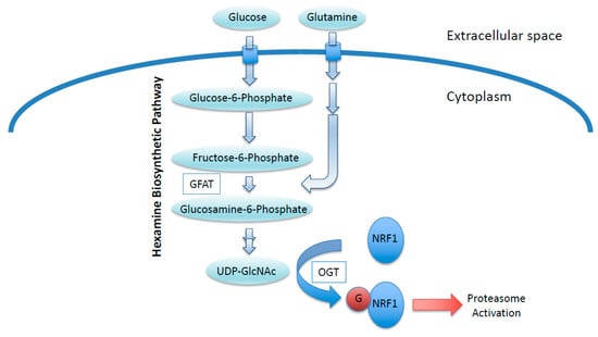 Since OGT is essential for the accumulation and transcriptional activation of NRF1, the regulation of NRF1 activity is thought to be influenced by the availability of UDP-GlcNAc, which is a substrate of OGT for O-GlcNAcylation. Indeed, NRF1 accumulation responds to the cellular availability of UDP-GlcNAc. When cells are exposed to high glucose to increase cellular UDP-GlcNAc levels or treated with an OGA inhibitor to increase O-GlcNAcylated protein levels, NRF1 accumulation and cellular O-GlcNAcylation levels are increased. It is very plausible that NRF1 activity is regulated by UDP-GlcNAc synthesis, which is often enhanced in cancer cells [28].