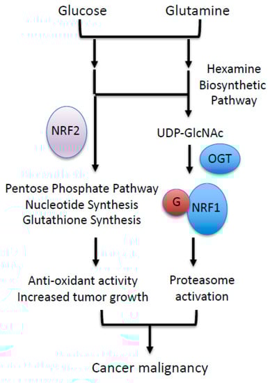 NRF1 (nuclear factor erythroid 2-like 1, NFE2L1), another member of the CNC–bZIP transcription factor family, also heterodimerizes with sMAF, binds to AREs, and activates target genes. The NRF1–sMAF heterodimer is known to activate proteasome subunit genes via ARE sequences in response to proteasome inhibitors, which is referred to as the “proteasome bounce back response” [24,25]. As several cancers have and depend on increased proteasome activity, proteasome inhibitors are considered effective therapeutics for these cancers [26,27]. However, NRF1 antagonizes the effect of proteasome inhibitors on cancer cell growth through the proteasome bounce back response, suggesting that the suppression of NRF1 activity sensitizes cancer cells to these compounds. Recently, O-GlcNAcylation of NRF1 by O-linked N-acetylglucosamine (GlcNAc) transferase (OGT) was found to be indispensable for the nuclear accumulation of NRF1 and transcriptional activation of NRF1 [28,29]. UDP-GlcNAc, a substrate of the O-GlcNAc reaction, is synthesized from glucose and glutamine and is expected to be abundantly available in cancer cells that consume large amounts of glucose and glutamine [30]. Indeed, cells cultured under high-glucose conditions have increased cellular O-GlcNAcylated proteins and, as expected, increased NRF1 protein levels [28,29]. Consistently, the suppression of O-GlcNAcylation enhances the anticancer effect of proteasome inhibitors in xenograft experiments [28].