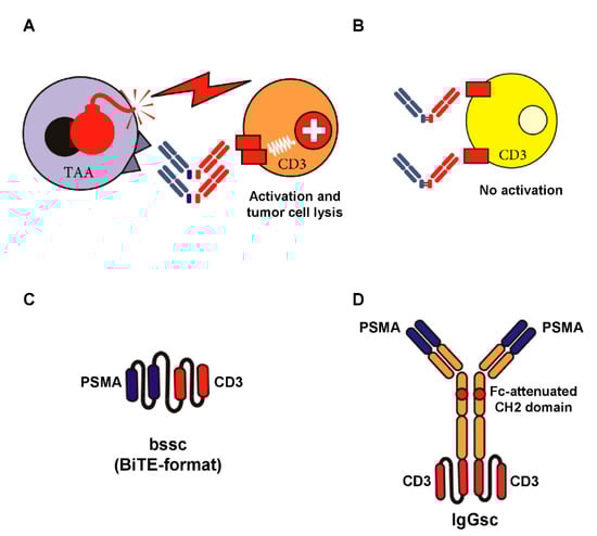 An alternative approach is to aim for antibody-mediated stimulation of T cells with their—compared to NK cells—higher effector potential using bsAbs [35], which recognize a TAA with their target arm and, with their effector arm, stimulate the TCR/CD3 complex (see Figure 1A,B). Multiple formats of bsAbs have meanwhile been developed, and the field is growing rapidly. Accordingly, we focus this review to formats emerging to clinical application in CRPC; a general overview on bsAb formats that are presently in development is provided in an excellent review by Brinkmann and Kontermann [36]. The only clinically approved reagent for cancer therapy in the class of bsAbs is the CD19xCD3 bsAb Blinatumomab for treatment of B-ALL [37]. So far, sustained therapeutic success of this and many other bsAbs presently undergoing clinical evaluation is forestalled by the unspecific activation of the T cell system, resulting in a potentially life threatening CRS. This in turn limits application of sufficient dosing to achieve optimal antitumor efficacy. “On-target off-tumor” activation due to expression of the selected target antigens on normal human tissue significantly contributes to this undesired phenomenon. To prevent this situation, the selected target antigen should ideally not be expressed on healthy cells. Moreover, binding of bsAbs to Fc-receptor-carrying cells has to be prevented (see Figure 1C,D).