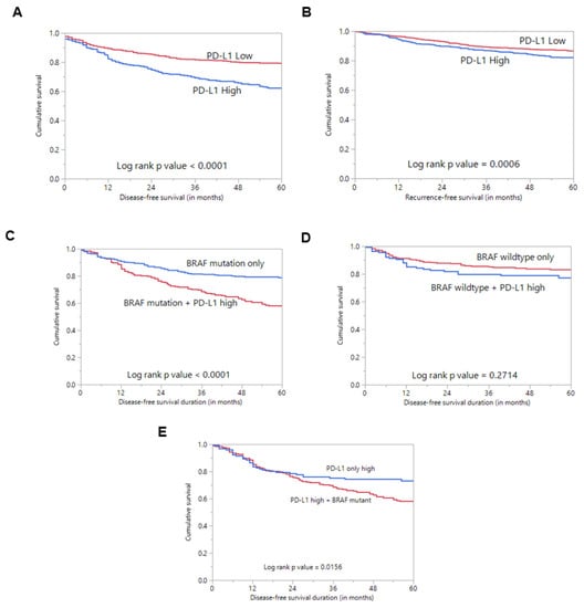 Survival analysis of PD-L1 protein expression. (A) Kaplan–Meier survival plot showing statistically significant poor disease-free survival in PD-L1 high-expression cases compared to PD-L1 low expression (p < 0.0001). (B) Kaplan–Meier survival plot showing statistically significant poor recurrence-free survival in PD-L1 high-expression cases compared to PD-L1 low expression (p = 0.0006). (C) Kaplan–Meier survival plot showing statistically significant poor disease-free survival in cases with co-existing PD-L1 expression and BRAF mutation compared to cases with BRAF mutation alone (p < 0.0001). (D) Kaplan–Meier survival plot shows no statistically significant difference in disease-free survival in cases with co-existing PD-L1 expression and wildtype BRAF compared to cases with wildtype BRAF alone (p = 0.2714). (E) Kaplan–Meier survival plot showing statistically significant poor disease-free survival in cases with co-existing PD-L1 expression and BRAF mutation compared to cases with PD-L1 expression alone (p = 0.0156).