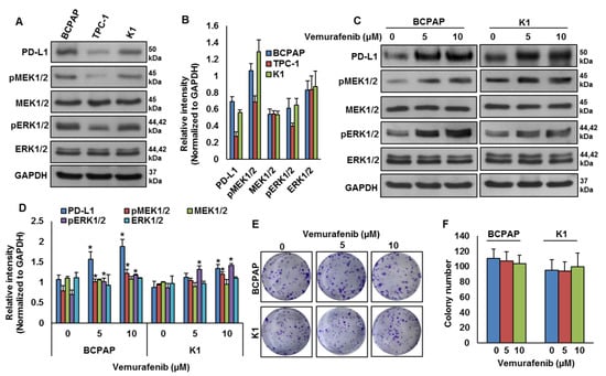 Our clinical data showed a significant association between PD-L1 over-expression and BRAF mutation. To test this association in vitro, we analyzed the basal expression of PD-L1 in PTC cell lines by immuno-blotting. We found high expression of PD-L1 in BRAF-mutated PTC cell lines (BCPAP and K1) compared to a wildtype BRAF PTC cell line (TPC-1) (Figure 3A,B). We also found increased expression of pMEK1/2 and pERK1/2 in BRAF-mutated cell lines compared to a wildtype cell line (Figure 3A,B). Next, we inhibited BRAF using vemurafenib and analyzed the expression of PD-L1, pMEK1/2 and pERK1/2 in BRAF-mutated cell lines. As shown in Figure 3C,D, inhibition of BRAF induced PD-L1, pMEK1/2 and pERK1/2 expressions in BRAF-mutated cell lines. However, vemurafenib treatment did not affect the colony-forming ability of PTC cells, as shown by clonogenicity assay (Figure 3E,F).