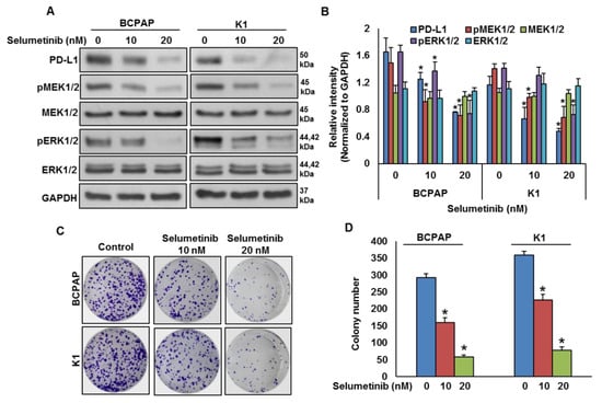 To test the effect of MEK inhibition on PD-L1 expression, BRAF-mutated cell lines were treated with a pharmacologic inhibitor for MEK, selumetinib, for 48 h and the expressions of PD-L1, pMEK1/2 and pERK1/2 were analyzed by immuno-blotting. As shown in Figure 4A,B, inhibition of MEK by selumetinib prominently downregulated the expressions of PD-L1, pMEK1/2 and pERK1/2 in BRAF-mutated cell lines in a dose-dependent manner. Furthermore, clonogenic ability was significantly reduced post-selumetinib treatment as compared to untreated control (Figure 4C,D).