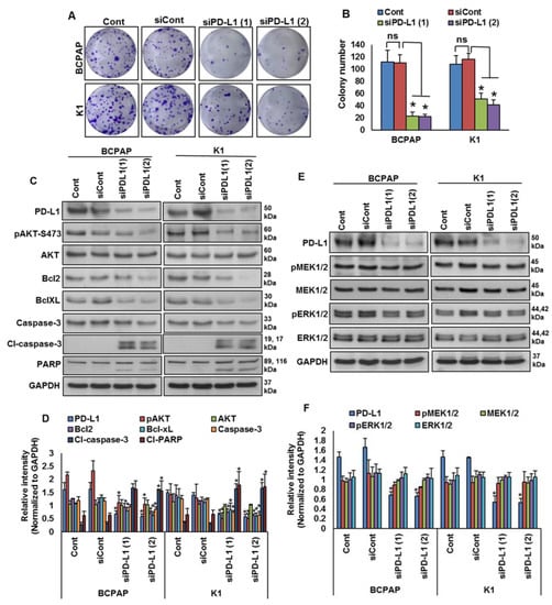 We showed that PD-L1 over-expression was significantly associated with BRAF mutation and poor survival in PTC patient samples. Therefore, we sought to determine whether targeting PD-L1 expression would be a viable therapeutic strategy to inhibit growth of BRAF-mutated cells. We knocked down PD-L1 in BRAF-mutated cells using specific siRNA and analyzed the cell growth by a clonogenicity assay. Knockdown of PDL1 using two different siRNA sequences significantly decreased the clonogenic ability of PTC cells after 48 h of transfection (Figure 5A,B). In addition, silencing of PD-L1 decreased AKT-Ser (473) phosphorylation, and downregulated anti-apoptotic proteins bcl2 and bcl-xL, as well as induced cleavage of caspase-3 and PARP, in BRAF-mutated cell lines (Figure 5C,D). However, knockdown of PD-L1 did not change the expressions of pMEK1/2 and pERK1/2, showing that PD-L1 functions downstream of the MEK/ERK signaling cascade (Figure 5E,F).