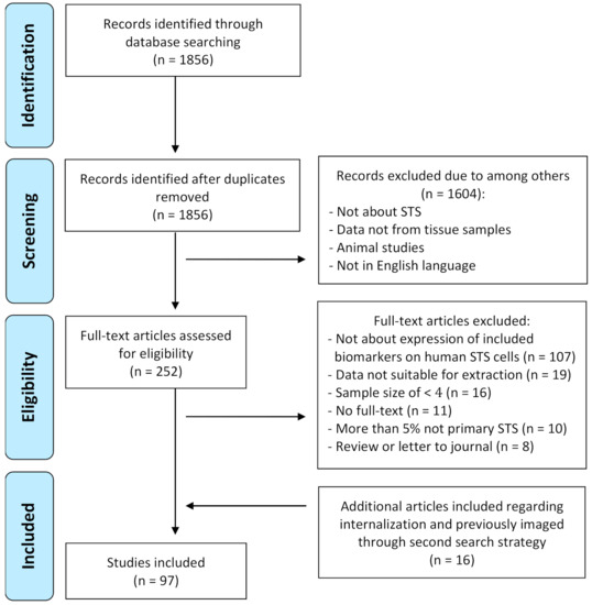 The PubMed search based on the cell surface-expressed biomarkers targeted by clinically available monoclonal antibodies identified 1856 articles (Figure 1). After screening the titles and abstracts, 1604 articles were excluded. Subsequently, 252 full-text articles were assessed for eligibility, of which 171 articles did not meet eligibility criteria; 107 articles did not study expression of the included biomarkers on human STS cells, for 19 articles data was not suitable for extraction, 16 articles had a sample size of less than 4 samples, 11 articles did not have full-text available, 10 articles had more than 5% of samples which were not primary STS and therefore their results were no longer a valid representation of STS samples, and 8 articles were reviews or letters to journals without an accompanying methods section. Data regarding internalization and previously imaged was not always described in STS. Therefore, a separate search was performed to obtain these data from other tissue types (Appendix B). This resulted in an additional 16 included articles. Ultimately, 97 articles were included for this review.