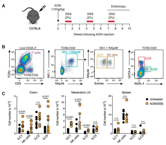 ILCs infiltrate colorectal tumours. (A) Schematic illustration of the AOM/DSS treatment protocol. Naïve C57BL/6 mice injected with AOM (10 mg/kg, i.p.) followed by three five-day cycles of 2% (w/v) DSS ad libitum in their drinking water separated by two weeks of normal water between each cycle. Tumours developed in the distal colon between 7–10 weeks after the commencement of treatment. (B) Flow cytometric analysis of ILCs within lamina propria isolated from the colon. Live CD45.2+ lymphocytes were segregated into T cells (TCRβ+CD3+) and ILCs (TCRβ−CD3−). ILC subsets were further delimited into NK1.1+NKp46+ ILC1 (Eomes−) and NK cells (Eomes+); ILC2s (GATA-3+) and ILC3 (RORγt+). (C) Enumeration of ILC subsets isolated from the colon, mesenteric lymph node (LN) and spleen of untreated and AOM/DSS-treated mice 7–10 weeks after initial treatment. Each dot represents one mouse. Data show mean ± s.e.m of results pooled from four independent experiments (n = 2–3 mice/treatment/experiment). Statistics were calculated using an unpaired Student’s t-test, p-value as indicated. n.s.: not significant.