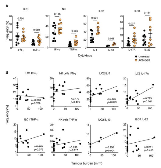 Increased cytokine expression during CAC. (A,B) Intracellular flow-cytometric analyses of TNF-α, IFN-γ, IL-5, IL-13, IL-17A and IL-22 cytokine production by colonic ILC1s, NK cells, ILC2s and ILC3s after short-term restimulation with PMA, ionomycin in the presence of Golgi Stop and Golgi Plug. Cells were stimulated for 4 h before staining. Frequency and correlation with tumour burden of cytokine-producing ILC isolated from the lamina propria of untreated and AOM DSS-treated mice. Each dot represents one mouse. Data show the mean ± s.e.m. IL-13 data is derived from one experiment and all other data are pooled from four independent experiments (n = 2–3 mice/genotype/experiment). Statistical differences were analysed using the Mann–Whitney nonparametric test. The correlation between frequencies and tumour burden was determined using Pearson’s correlation coefficient to calculate r. Both the r coefficient and p-values are indicated.