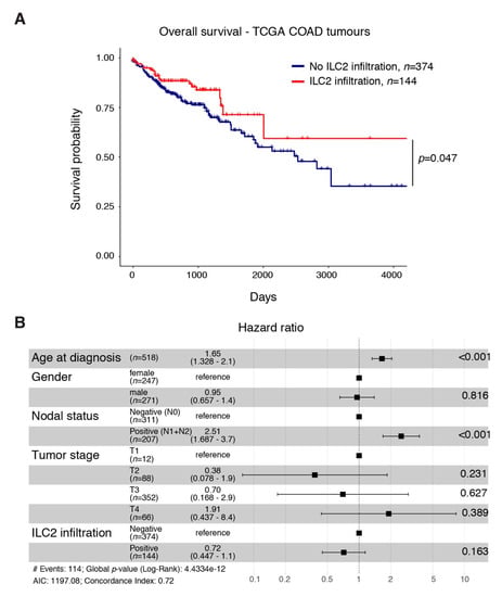 An ILC2 gene signature identifier is associated with improved overall survival for CRC patients. (A) Analysis of the impact of tumour ILC2 infiltration on colorectal cancer patient survival using the publicly available TCGA database. (B) Multivariate analyses showing hazard ratio of the impact of the age at diagnosis, gender, the presence of metastatic lymph nodes, tumour stage and ILC2 infiltration probability on CRC patient survival.