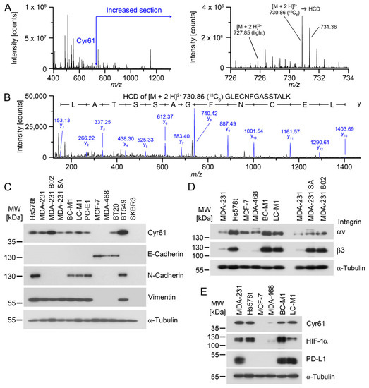 Detection of Cyr61 in tumor cell lines with mesenchymal attributes. (A) Detection of Cyr61 by SILAC LC-MS/MS. Left: MS1 (survey scan) mass spectrum containing the peptides around m/z 731 Da. Right: enlarged section of the Cyr61 peptides containing the light masses from MDA-MB-468 and the 13C6-labelled peptides of BC-M1. (B) Positive ion mode HCD (higher-energy collisional dissociation) spectrum of m/z 730.86 [M + 3 H]3+ Da. The relevant fragments of the y-ion series are assigned with their masses. (C) Confirmation of the differential expression of Cyr61 and comparison with the epithelial grade in breast cancer cell lines or DTC cell lines (BC-M1, LC-M1, PC-E1) by Western blot analysis. (D) Detection of the integrin species in the breast cancer cell lines by Western blot analysis. (E) Comparison of the protein levels of Cyr61, HIF-1α and PD-L1 in the breast cancer cell lines, as detected by Western blot analysis. (A,B) nbiol = 4; (C–E): nbiol = 3.