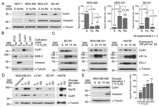 Response of the Cyr61 levels to hostile microenvironmental conditions; analyses by Western blot analysis. The starting conditions for all of the experiments were the standard cell culture conditions (S). (A) Response of Cyr61 levels to chronic hypoxia (14 days 1% O2; condition Hy) and reoxygenation (Re: Hy followed by 10% O2 for 4 h). The statistical analyses of the changes in the protein levels are shown in the bar diagrams (right), and the obtained p-values are presented as numbers. The p-values were calculated using Student’s t-test (nbiol = 3). The corresponding scatterplot is shown in Figure S2. (B) Downregulation of Cyr61 under hypoxia (1% O2) and the induction of ErbB-2 under hypoxia. (C) Effect of the stabilization of HIF-1α to Cyr61 and PD-L1 levels after the treatment of the cells with cobalt chloride. (D) Effect of glucose starvation on the Cyr61 levels. As a large amount of MDA-MB-231 cells detached from the cell culture flask after 50 h of glucose withdrawal, the detached cells were analysed separately. The 78 kDa glucose-regulated protein (Grp78) was analysed as a positive control for a cellular response after glucose withdrawal. (E) Induction of Cyr61 under hypoxia and glucose starvation. The diagrams display the quantitative analyses of the Cyr61 levels of the Western blot images (nbiol = 3). The numbers above the error bars (standard deviation) represent the average values. The corresponding scatterplot is shown in Figure S3.