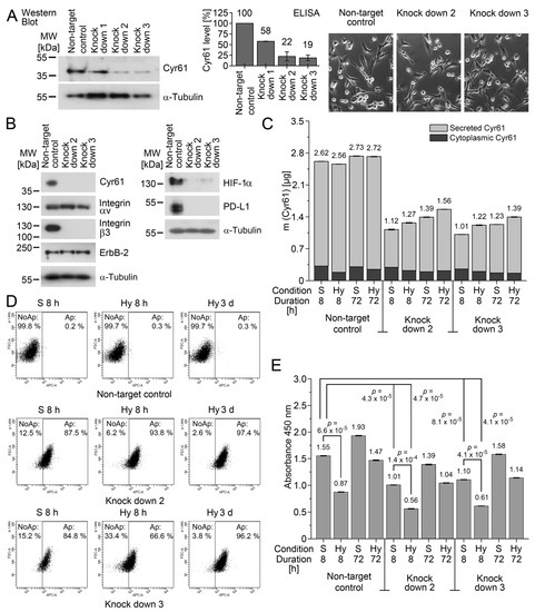 Cyr61 knockdown in MDA-MB-231 cultured under standard conditions (S) and under hypoxia (1% O2; Hy). (A) Establishment of Cyr61 knockdowns in MDA-MB-231 by shRNA. The cytoplasmic Cyr61 knockdown was detected by Western blot (left), quantified by ELISA (diagram), and analysed for morphologic changes (photomicrographs, right). The corresponding scatterplot is shown in Figure S4. (B) Cyr61 knockdown in MDA-MB-231 by shRNA, analysed by Western blot analysis. (C) Analysis of cytoplasmic and secreted Cyr61 by ELISA (nbiol = 3). The numbers refer to the sum values of the cytoplasmic and secreted Cyr61. The corresponding scatterplot is shown in Figure S5. (D) The apoptosis rate in the cells detected by APC (allophycocyanin)-labelled Annexin V, and the relative cell size (FSC-A). The percentages of non-apoptotic (NoAp) and apoptotic (Ap) cells are denoted as numbers for each experiment. (E) Bromodeoxyuridine (BrdU) assay for the analysis of the cell proliferation. The p-values (given as numbers) were calculated using Student’s t-test (nbiol = 3). The corresponding scatterplot is shown in Figure S6.