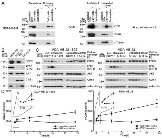 The induction of Cyr61 expression by EGF stimulation has been previously investigated mainly for cytoplasmic Cyr61. However, if Cyr61 acts as a ligand, e.g., for the integrins, the secreted Cyr61 is of particular relevance. For the investigation of the Cyr61 secretion, we selected MDA-MB-231 cells that are positive for the EGF receptor (Figure 4B). Moreover, we analysed the bone metastasis cell line B02 that was derived from MDA-MB-231. B02 displays strongly-elevated EGFR levels compared with MDA-MB-231 by Western blot analysis, such that the EGFR signal for MDA-MB-231 appears to be weak in this image. The comparison of the Cyr61 kinetics between MDA-MB-231 and B02 may also display specific changes that occur in the course of the colonization of the bone marrow.