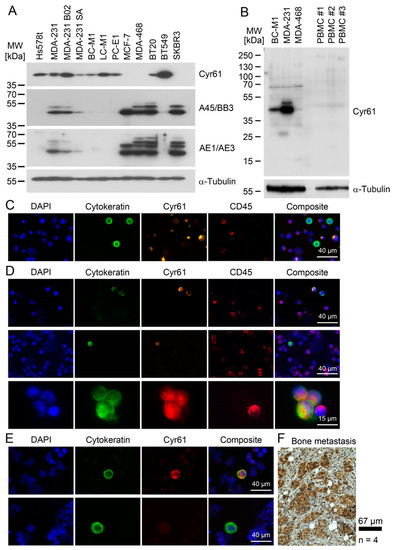Cyr61 detection in breast cancer cells. (A) Comparison of the cytoplasmic Cyr61 levels with cytokeratin levels, as analysed by the pan-cytokeratin antibody cocktails A45/BB3 and AE1/AE3 by Western blot analysis. (B) A comparison of the Cyr61 levels in the peripheral blood mononuclear cells (PBMC) of healthy women with the Cyr61 levels in breast cancer cell lines. (C) Cyr61 detection in BC-M1 and MDA-MB-468 spiked into blood samples from healthy women by immunocytochemical double staining. (D) Cyr61 detection in CTC from the peripheral blood of breast cancer patients (details: Table 1). (E) Detection of Cyr61 in the DTC from the bone marrow of breast cancer patients. The upper row shows a Cyr61-positive DTC, and the bottom row shows a Cyr61-negative DTC. (F) An immunohistochemical Cyr61 detection in the bone metastases of breast cancer patients. (C–E) The composite images are overlays of the Cytokeratin, Cyr61, Dapi and CD45 (if applied) signals, nbiol: 3 (A,C,E), 4 (F).