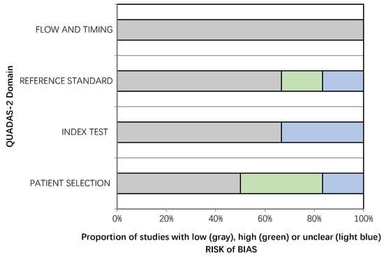 - Whiting, P.F.; Rutjes, A.W.; Westwood, M.E.; Mallett, S.; Deeks, J.J.; Reitsma, J.B.; Leeflang, M.M.; Sterne, J.A.; Bossuyt, P.M.M.; The QUADAS-2 Group. QUADAS-2: A Revised Tool for the Quality Assessment of Diagnostic Accuracy Studies. Ann. Intern. Med. 2011, 155, 529–536. [Google Scholar] [CrossRef]