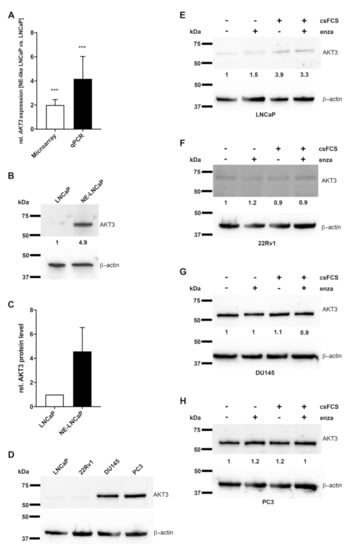 Expression of AKT3 is increased in neuroendocrine (NE)-like LNCaP cells and inhibited by androgen receptor (AR) signaling in prostate carcinoma (PCa) cells. (A) According to the results of microarray data from Dankert et al. 2018 (white bar; p = 0.0002) AKT3 expression was validated by qRT-PCR (black bar; p = 0.0007) confirming increased AKT3 expression in NE-LNCaP compared to normal LNCaP cells on mRNA level (*** p < 0.001). (B) Representative western blot analysis using anti-AKT3 mAb confirms induced AKT3 protein level in NE-like LNCaP cells. (C) Densitometrical quantification of western blot analyses represents the relative upregulation (4.5-fold) of AKT3 protein in NE-like LNCaP cells, determined in five independent experiments in relation to corresponding β-actin as loading control. (D) Western blot analysis of four PCa cell lines using anti-AKT3 mAb depicts different AKT3 expression in AR-positive and AR-negative PCa cell lines. PCa cell lines were treated with androgen deprivation or 10 µM enzalutamide followed by western blot assays for AKT3 expression. The treatments increased AKT3 protein expression in LNCaP cells (E), whereas AKT3 expression did not change in 22Rv1 (F), DU145 (G) and PC3 (H) cells.
