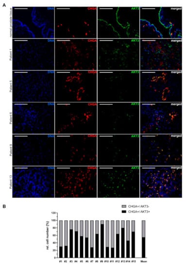 AKT3 colocalization with NE cell marker chromogranin A (CHGA) in advanced prostate cancer tissue. (A) Immunofluorescence double staining of normal prostate tissue and representative tissue samples from five patients with neuroendocrine differentiated prostate carcinoma showing CHGA-positive cells expressing AKT3 (DNA: blue, CHGA-positive NE-cells: red, AKT3: green, double positive cells: yellow; Magnification: 400×, scale bar: 100 µm). (B) Three areas per patient with neuroendocrine differentiated prostate cancer were documented and only samples with more than 20 neuroendocrine cells were analyzed. The number of CHGA-positive NE cells was normalized to 100% (grey bar). Graph shows statistical evaluation that demonstrates colocalization of CHGA and AKT3 (black bar) in approximately 55% of neuroendocrine cells.