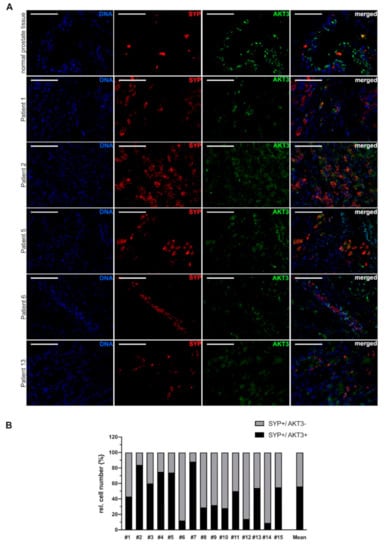 These results were validated using synaptophysin as an additional marker for neuroendocrine cells. One picture set of normal prostate tissue and five representative picture sets from patients with neuroendocrine PCa double stained for SYP/AKT3 are shown in Figure 3A. According to the results of CHGA/AKT3 double staining, we detected a subpopulation of neuroendocrine cells which express AKT3. Figure 3B shows the statistical analysis where about 55% of SYP-positive neuroendocrine cells express AKT3.