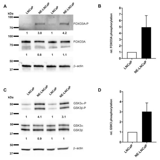Our results indicate that AKT3 may play a role in NE-like LNCaP cells as well as in neuroendocrine differentiated prostate cancer. Therefore, we examined whether the AKT3 signaling pathway is induced in NE-like LNCaP cells. AKT3 is a protein kinase, which phosphorylates serine and threonine residues and which hereby regulates the activity of different proteins as Forkhead box O3 (FOXO3A) or Glykogen synthase kinase 3 (GSK3α/β). For analysis of AKT3 downstream targets, we performed western blot analysis to determine the phosphorylation status of Ser253 (FOXO3A) and Ser21/ Ser9 (GSK3α/β). Neuroendocrine differentiation of LNCaP cells does not affect protein expression of FOXO3A, whereas analysis of phosphorylation at Ser253 shows an increase of phosphorylation (Figure 4A). Four independently performed experiments are depicted in Figure 4B and show a 5-fold elevated phosphorylation of FOXO3A at Ser253 using β-actin as loading control. Figure 4C,D illustrate that total protein level of GSK3 also is not affected by neuroendocrine differentiation of LNCaP cells, but the phosphorylation status of Ser21/Ser9 is 3-fold increased. These results indicate an induction of FOXO3A and GSK3α/β phosphorylation due to NETD of LNCaP cells.