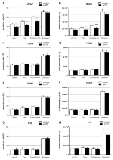 Effects of AKT3 expression on apoptosis of PCa cell lines were analyzed by Annexin V/propidium iodide (PI) staining and caspase 3/7 activity. Cells were transfected with control or AKT3 expression plasmid and apoptosis was induced by adding FasL (200 ng/mL), enzalutamide (10 µM) or docetaxel (20 nM) 24 h after transfection. Staining with Annexin V-FITC/ PI was performed 72 h post treatment and followed by flow cytometry analysis. Graphs show the mean ± SEM of four independent experiments. (A) Percentage of apoptotic cells decreased significantly (*** p < 0.001) after AKT3 overexpression in untreated LNCaP cells (p = 0.0008) as well as FasL (p = 0.0001) and enzalutamide (p = 0.0002) treated LNCaP cells. (B) Caspase 3/7 activity was measured 48 h after treatment by microplate reader. AKT3 overexpression in LNCaP cells has a slightly effect on caspase 3/7 activity. After induction of apoptosis with FasL (p = 0.0377; * p < 0.05) or enzalutamide (p = 0.0004; *** p < 0.001), AKT3 overexpression leads to a significant reduction of caspase 3/7 activity in LNCaP cells. AKT3 expression in 22Rv1, DU145 and PC3 cells has no effect on the relative proportion of apoptotic cells (C,E,G) as well as on caspase 3/7 activity (D,F,H).