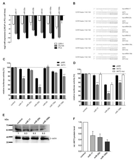 Subsequently, miRNAs as a possible reason for enhanced AKT3 protein level in NE-like LNCaP cells were analyzed. Target gene analysis using TargetScan identified AKT3 as a putative target gene for the miR-17 family. We had previously shown a decreased expression of miR-17 family (on average 0.2-fold) in NE-like LNCaP cells, established by androgen withdrawal, in comparison to undifferentiated LNCaP cells [], indicating a correlation between miR-17 family and AKT3 expression. Additionally, we compared the expression of miR-17 family members in LNCaP cells with 22Rv1 cells as well as DU145 and PC3 cells which stably express AKT3. In 22Rv1 cells, which express no AKT3, the miR-17 family expression is 0.1-fold lower than in LNCaP cells, whereas DU145 and PC3 cells do not express members of miR-17 family, except miR-106b in PC3 cells (0.25-fold) (Figure 6A). The putative miRNA target sites inside the 3′UTR of AKT3 are depicted in Figure 6B. A fragment of the AKT3 3′UTR containing the corresponding miRNA binding site was inserted into a luciferase reporter gene plasmid and luciferase reporter gene assays were performed. The reporter gene constructs were cotransfected with an expression vector for the respective miRNA. MiR-17, −20b and −106b significantly (each p = 0.0001) reduce luciferase activity of the AKT3 reporter gene construct by 20–25% (Figure 6C) whereas miR-20a, −93 and −106a do not repress the luciferase activity. The binding of the miRNAs to the predicted target site of the 3′UTR was confirmed by site directed mutagenesis of the corresponding miRNA seed sequence. The modified miRNA binding sites of AKT3 3′UTR are depicted in Figure 6B. Figure 6D shows an increase of luciferase activity to initial control level after mutation of the miRNA binding site inside AKT3 3′UTR, indicating a loss of miRNA binding. To investigate the regulatory abilities of the miR-17 family members on endogenous AKT3 biosynthesis, the respective miRNAs were ectopically expressed in LNCaP cells and AKT3 protein level was analyzed by western blot. A representative western blot analysis of reduced (0.3-fold) AKT3 protein level in LNCaP cells after overexpression of miR-17, −20b or −106b is depicted in Figure 6E. Figure 6F shows the mean of three independently performed western blot analyses after overexpressing miR-17, −20b and −106b, demonstrating that AKT3 is negatively regulated (0.3–0.5-fold) by particular members of the miR-17 family.