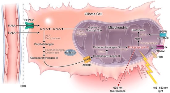 Uptake of exogeneous 5-ALA via active transport is cell-specific and provides negative feedback to 5-ALA synthase and accumulation of PpIX in the cell. PpIX efflux from the cell has also been studied and shown to be dependent on several factors. PpIX is synthesized in the mitochondria but quickly transports to the cytosol []. The mitochondrial peripheral benzodiazepine receptor (PBR) is one possible mechanism that has been shown to contribute to PpIX accumulation. In one study, PpIX concentration diminished with the administration of a competitive peripheral benzodiazepine receptor blockade concurrently with 5-ALA []. Another study showed that induction of PBR in glioma cell lines caused corresponding increases in intracellular PpIX concentration []. ATP-binding cassette transporter G2 (ABCG2) is another transporter that has been studied in the context of PpIX, with an inverse correlation between transporter expression and 5-ALA accumulation, although ABCG2 may be differentially expressed in GBM [,,]. Further, cadherin 13 has been reported as a potential regulator of ABCG2 and PEPT1 expression and, accordingly, PpIX accumulation in glioma cells []. Overexpression of another ATP-binding cassette transporter known to regulate porphyrin synthesis, ABCB6, has also been shown to increase PpIX accumulation in glioma cell lines and subsequently increase PDT effects []. Epidermal growth factor receptor (EGFR) and EGFRvIII co-expression has been shown to influence 5-ALA fluorescence in GBM []. Additionally, PpIX efflux out of the cell was reported in the presence of fetal bovine serum [].