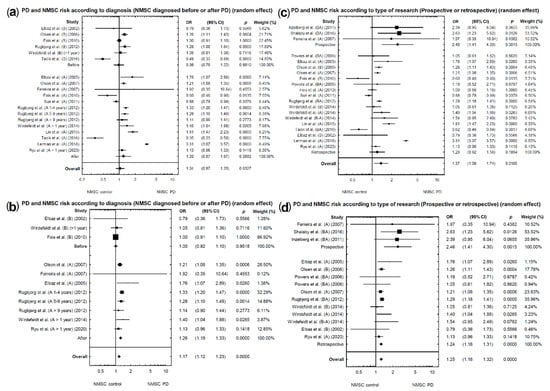 (a,b) Forest plot of pooled studies of NMSCs diagnosed before or after incidence of PD in patients: (a) all studies; (b) studies causing high heterogeneity excluded. (c,d) Forest plot of pooled studies of NMSC incidence in PD patients according to the type of study (prospective or retrospective): (c) all studies; (d) studies causing high heterogeneity excluded. Each line represents an individual study result, with the width of the horizontal line indicating a 95% confidence interval (CI) and the position of the box representing the point estimate OR (odds ratio) (B—NMSCs before PD diagnosis, B-A NMSCs diagnosed ± 1 year before or after PD diagnosis.