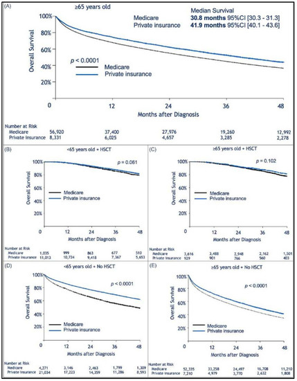 Kaplan–Meier estimation of overall survival comparing patients insured by Medicare or with private insurance. In (A) Among patients aged ≥65 years, private insurance was associated with longer survival; (B,C) No insurance-related difference in survival was observed for patients who received an autologous transplant. In (B), patients younger than 65 years old who received Hematopoietic Stem Cell Transplantation (HSCT), and in (C), patients ≥65 years old who received HSCT; however, for patients who did not receive a transplant, the influence of insurance type was again present. In (D), patients younger than 65 years old who did not undergo autologous transplant, and in (E) patients ≥65 years old who did not receive autologous transplant.