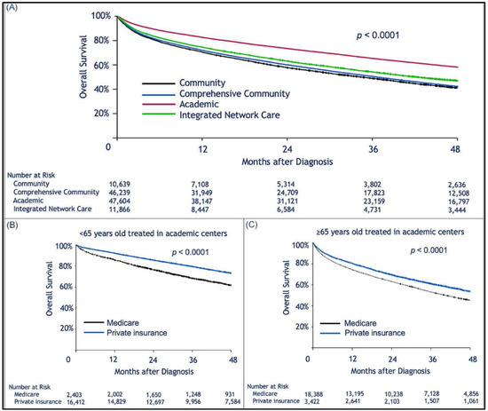 Kaplan–Meier estimation of overall survival comparing patients treated in different types of treatment centers. Treatment in an academic facility was associated with longer survival of multiple myeloma patients. However, privately insured patients treated at such facilities had better survival than those insured by Medicare. Kaplan–Meier estimation of overall survival as a function of: (A), treatment facility type; (B,C), show survival of patients privately insured or insured by Medicare who were treated at academic facilities; (B), patients aged <65 years; (C), patients ≥65 years old.
