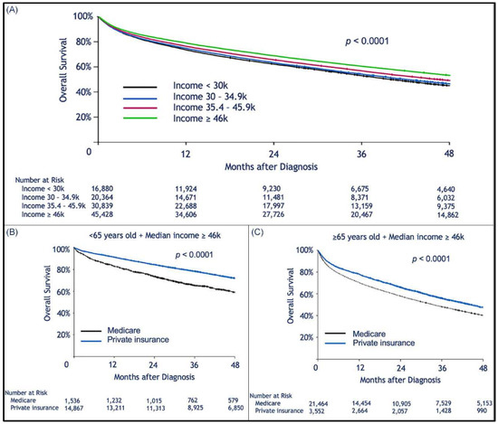 Kaplan–Meier estimation of overall survival comparing patients living in areas with different median household incomes. Higher median income was associated with longer survival after a diagnosis of multiple myeloma. Kaplan–Meier estimation of overall survival as a function of median (zip-code-based) income (A); among patients in the higher median income bracket, patients insured by Medicare had worse survival than those with private insurance (B,C); this effect was seen in the subgroup of patients <65 years old (B), and in the cohort of patients ≥65 years old.