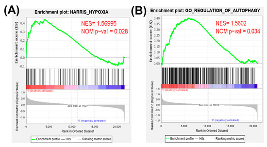 Gene set enrichment analysis (GSEA) of hypoxia and autophagy gene expressions in primary tumors and normal tissues derived from patients with triple-negative breast cancer (TNBC). All of the expressed genes were uploaded into GSEA for enrichment analysis. The Harris hypoxia (A) and Gene Ontology (GO) regulation of autophagy (B) gene sets database were used as the gene set collection for analysis. NES, normalized enrichment score; NOM p-val, nominal p value.
