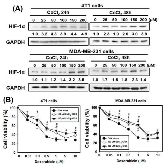 The chemical hypoxia (CoCl2) stabilizes hypoxia-inducible factor 1α (HIF-1α) protein and causes doxorubicin (DOX) resistance in TNBC cells. (A) the protein level of HIF-1α in 4T1 and MDA-MB-231 cells treated with CoCl2 for 24 and 48 h. (B) effect of DOX on cell viability of 4T1 and MDA-MB-231 cells in the absence or presence of CoCl2. Cells were pretreated with CoCl2 for 48 h and then treated with DOX for 24 h. * p < 0.05 DOX alone compared with 100 μM CoCl2 + DOX. # p < 0.05 DOX alone compared with 200 μM CoCl2 + DOX.