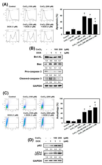 Detection of apoptosis and autophagy in 4T1 cells that received DOX and/or CoCl2 treatments. (A) apoptosis was analyzed by flow cytometry with an Annexin V apoptosis detection kit. 4T1 cells were pretreated with CoCl2 for 24 h and then treated with DOX for 24 h. * p < 0.05 compared with control. # p < 0.05 DOX alone compared with 200 μM CoCl2 + DOX. (B) effects of apoptosis-related protein expression in 4T1 cells treated with DOX and CoCl2 alone or in combination. Cells were pretreated with CoCl2 for 24 h and then treated with DOX (1 μM) for 24 h. (C) measurement of acidic vesicular organelles (AVOs) in acridine orange (AO)-stained cells using flow cytometry. 4T1 cells were pretreated with CoCl2 for 24 h and then treated with DOX for 24 h. * p < 0.05 compared with control. # p < 0.05 DOX alone compared with 200 μM CoCl2 + DOX. (D) effects of autophagy-related protein expression in 4T1 cells treated with DOX and CoCl2 alone or in combination. Cells were pretreated with CoCl2 for 24 h and then treated with DOX (1 μM) for 24 h.