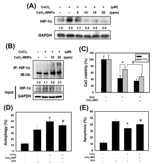 We found that CaO2-modified MNPs can inhibit the CoCl2-stabilized HIF-1α in a concentration-dependent manner in 4T1 cells (Figure 5A). It is well known that rapid degradation of specific proteins by ubiquitin-proteasome system (UPS) is a component of many cellular mechanisms [35]. We speculated that CaO2-MNPs cause HIF-1α degradation through ubiquitination. To study this possibility, we investigated the HIF-1α ubiquitination by immunoprecipitation (IP). We observed that CaO2-MNPs induced HIF-1α ubiquitination (Figure 5B). Therefore, CaO2-MNPs-triggered the HIF-1α degradation may be regulated by UPS. Next, we found that pre-treatment with CoCl2 markedly increased doxorubicin-resistance in 4T1 cells (Figure 5C). However, CaO2-MNPs inhibited the CoCl2-induced doxorubicin-resistance. We further investigated the effect of autophagy and apoptosis by CaO2-MNPs. CoCl2 increased the doxorubicin-induced autophagy while CaO2-MNPs significantly suppressed that effect (Figure 5D). Additionally, CaO2-MNPs reverted doxorubicin-induced apoptosis under CoCl2 treatment (Figure 5E).