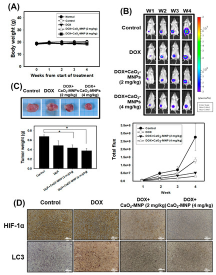The anti-cancer effects of DOX in combination with CaO2-MNPs in an orthotopic mouse model. The female Balb/c mice were injected with 5 × 104 4T1 cells orthotopically into the 4th mammary fat pad. (A) the body weight was measured weekly in the different groups. (B) the bioluminescence imaging of tumors was used in vivo imaging system (IVIS) 200 system with Living Image Software. (C) the tumor weight was analyzed after sacrificing. * p < 0.05 control compared with DOX + CaO2-MNPs. (D) specific immunostaining was conducted on 4T1 tumor sections showing the expression of HIF-1α and LC3 in response to various treatments in vivo. Scale bars = 50 µm.