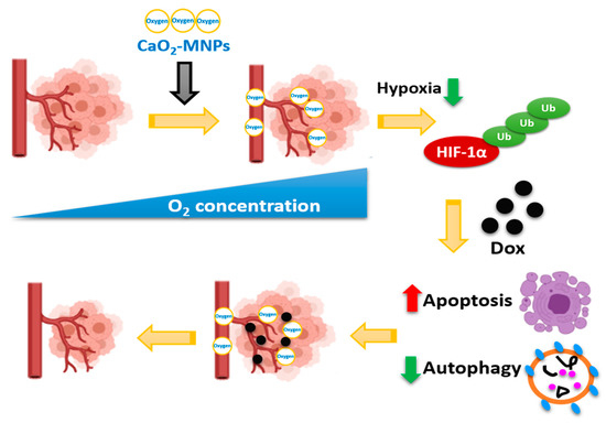 CaO2-MNPs attenuate hypoxia-induced chemoresistance in TNBC. CaO2-MNPs release oxygen and degrade HIF-1α protein by ubiquitination. Hypoxia inhibit the DOX-induced apoptosis and DOX-increased autophagy in TNBC cells. CaO2-MNPs promote cell death against DOX-induced resistance under hypoxia through the inhibition of autophagy and induction of apoptosis. Therefore, co-treatment with CaO2-MNPs and DOX could be an effective approach to attenuate HIF-1α-mediated hypoxic responses to modulate TNBC. The figure was created with BioRender.com.