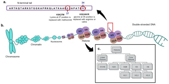 Histones are essential proteins that pack DNA molecules into nucleosomes and further condense these primary packaging units into chromatins [,]. These essential proteins are divided into core histones (H2A, H2B, H3 and H4) and linker histones (H1 or H5) []. The core histones are found at the centre of nucleosomes, while linker histones interact with the nucleosomes and the linker DNA located between two nucleosomes. The centre of the nucleosomes contains an octamer of the four core histones in dimeric forms (Figure 2). Among the four core histones, mutations of H3 were first detected in pHGGs in 2012 []. H3 has three variants or isoforms, namely H3.1, H3.2 and H3.3, which are encoded by different genes. In pHGGs, mutations commonly take place at the N-terminal end of H3. This site plays a role in post-translational modifications such as methylation, phosphorylation, ubiquitination, acetylation, the regulation of DNA replication, DNA repair and RNA transcription []. The most common histone H3 mutation involves the substitution of lysine at position 27 with methionine (H3K27M) in variants H3.1 and H3.3, encoded by the HIST1H3B and H3F3A genes, respectively []. In addition, other mutations also take place in histone H3.3, of which glycine 34 is replaced with valine or arginine (H3.3G34V/R), mainly involving the H3F3A gene []. In general, the prevalence of H3K27M in pHGGs is higher than H3.3G34V/R. The H3.3 and H3.1 mutations were detected in FFPE tissues from 143 paediatric high-grade astrocytomas using immunohistochemistry, and this result was in good agreement with that determined with the pyrosequencing method [].