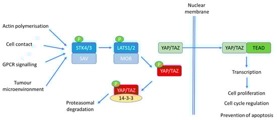 One such signalling pathway that has been gaining significant interest in PC research is the Hippo pathway (Figure 1). Indeed, this pathway is proving to be critical in many cancers. Originally discovered in the fruitfly, Drosophila melanogaster [1], its conservation across the species to regulate organ size, proliferation and stem cell biology makes its dysregulation an obvious interest to cancer biologists. The Hippo pathway is a cascade of kinase enzymes which, in response to various stimuli including cell–cell contact, nutrients and the surrounding microenvironment, inhibit downstream effector proteins, namely, YAP/TAZ, to switch off transcriptional programmes which promote cell growth. Critically, this is not the only method of regulation for these effector proteins which themselves have been found to be altered in cancers, including PC.