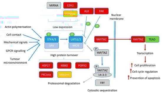 Potential therapeutic targets to reactivate the Hippo pathway. Modulation of upstream kinases STK3/4 and LATS1/2 occurs via post-translational modifications and transcriptional regulation. In cancer, a number of these molecules responsible for this regulation are altered. Molecules can be mutated (orange), overexpressed (red) or lost (grey) to result in high turnover or transcriptional silencing. This turns off the Hippo signalling cascade, allowing effector proteins, YAP/TAZ, to enter the nucleus and activate gene transcription, resulting in higher cell proliferation, cell cycle modulation, expression of other oncogenes such as c-Myc and AR and prevention of apoptosis, to name but a few processes.