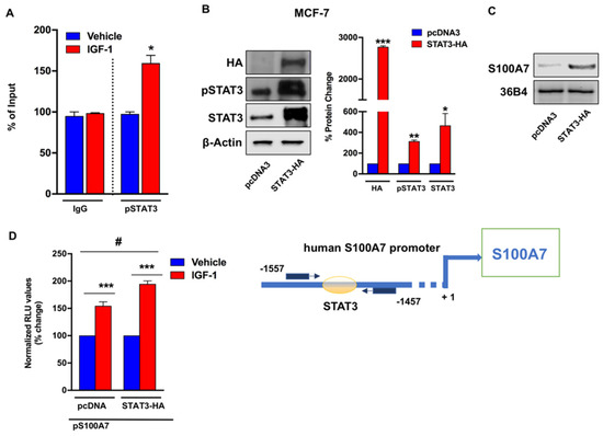 Nevertheless, additional details on the molecular mechanisms involved in the activation of STAT3 by IGF-1 and the STAT3-dependent transcription of S100A7 could be retrieved in further studies aimed at interrogating whether IGF-1 differentially regulates STAT3 nuclear translocation, and whether IGF-1 affects both STAT3 phosphorylation and DNA-binding capability.