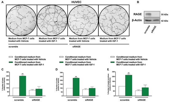 Subsequently, the angiogenic response to the conditioned medium obtained from MCF-7 cells was assessed through endothelial cell tube formation assay [33]. As shown in Figure 7, we detected a ramified network of tubules in HUVECs cultured in conditioned medium collected from MCF-7 cells treated with IGF-1 (Figure 7A,B). This effect was no longer evident in HUVECs previously transfected with siRNA sequences specifically targeting RAGE (Figure 7A–E). Similar results were obtained performing tube formation assay using HUVECs cultured in medium collected from T47D cells treated with IGF-1 and silenced for IGF-1R expression (data not shown). Further corroborating these findings, the efficiency of endothelial tube formation was significantly reduced when HUVECs were cultured in conditioned medium from MCF-7 cells stimulated with IGF-1 in the presence of the RAGE inhibitor FPS-ZM1 (Figure S2A–C).