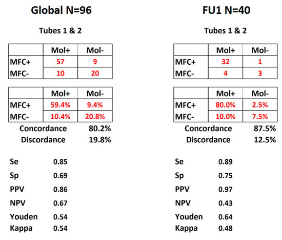 MRD concordance matrices. Display of the results for all 96 FU time points and FU1 of the 40 patients. Both panels show the matrices of numbers and percentages of concordance between molecular and MFC MRD detection according to the combination of tubes 1 and 2. Se: sensitivity, Sp: specificity, PPV: positive predictive value, NPV: negative predictive value. Youden and kappa tests were used and values displayed as well.
