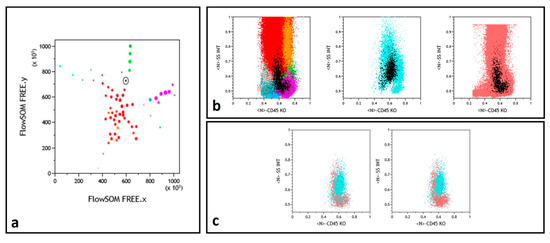 Myelomonocytic regeneration. (a) Position of a selected node (round black gate) on the FREE NBM representation, between immature granulocytes (dark red) and monocytes (green). Color codes from ref. [13,15]. (b) Backgating (black dots) of this node identifying a regeneration pattern similar in NBM (left) and FU (right) samples and a different population in the middle Dg histogram. (c) Selected node CD45/SSC representation with superimposition of the NBM (gray) and FU (powder pink) events while Dg sample (cyan) events are differently backgated.